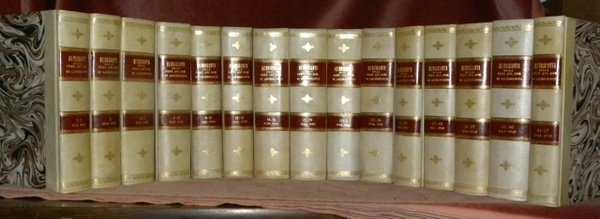 250x165mm, reliés demi parchemin, étiquettes de titre et de tomaisons rouge aux dos, ornementations dorées, plats papier marbré, belles reliures.