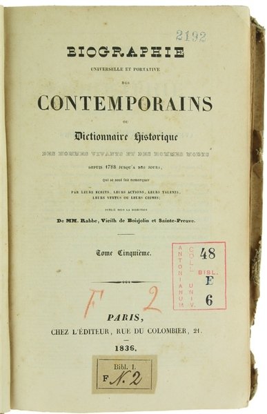 BIOGRAPHIE UNIVERSELLE ET PORTATIVE DES CONTEMPORAINS OU DICTIONNAIRE HISTORIQUE DES HOMMES VIVANTS ET DES HOMMES MORTS DEPUIS 1788 JUSQU'A NOS JOURS. | Livres anciens et modernes | Rabbe, Vieilh De Boisjolin Et Sainte-Preuve.