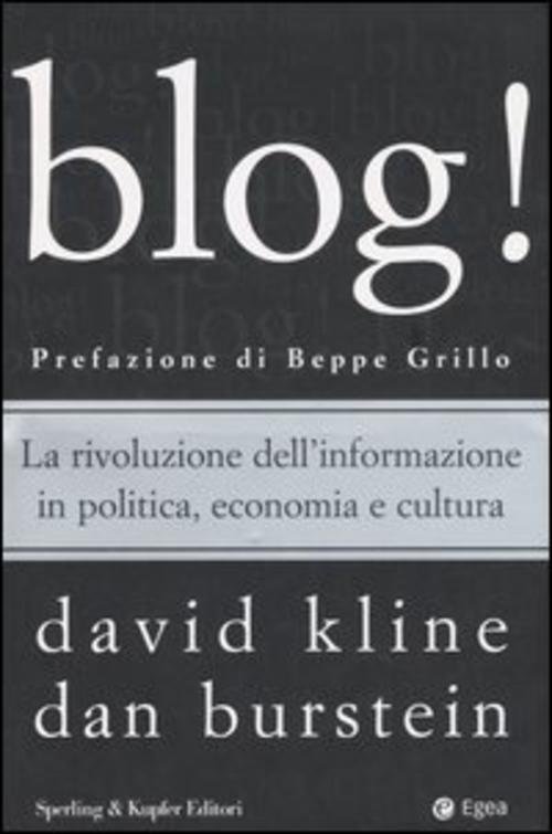 Dettagli Libro<br><br>Sku: PZZLB18962<br>ISBN: 9788820041441<br>Titolo: Blog!<br>Autore: David Kline<br>Editore: Sperling & Kupfer<br>Anno: 2006<br><br>Il blog è una realtà globale. La sua sensazionale affermazione come strumento di pubblico dibattito e di espressione individuale ha catturato l'attenzione del mondo. E se ne capisce facilmente il perché. Con i blog c'è chi ha stroncato la carriera di politici e costretto alle dimissioni pezzi grossi della televisione. In altri casi, invece, il blog ha premiato i prodotti di aziende poco note proiettandole al successo da un giorno all'altro, e sanzionato la rovina di altre, colpevoli di aver ignorato le giuste lamentele dei consumatori. Chi sono questi esperti dilettanti, e come si sono serviti del nuovo mezzo di comunicazione per trasformare non solo la propria vita, ma anche la società? E la rivoluzione dei senza voce in capitolo contro la sciatteria del potere? Un libro che porta dritti nel cuore e nel cervello dei più influenti blogg