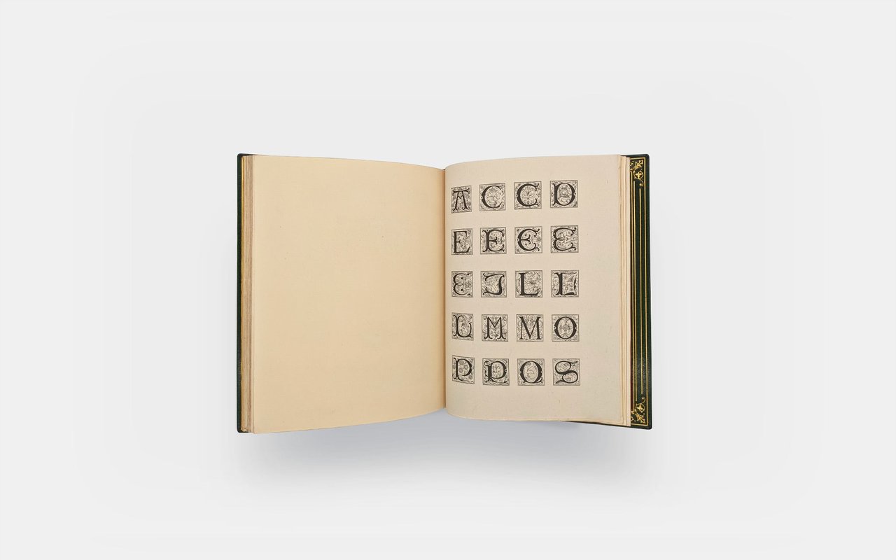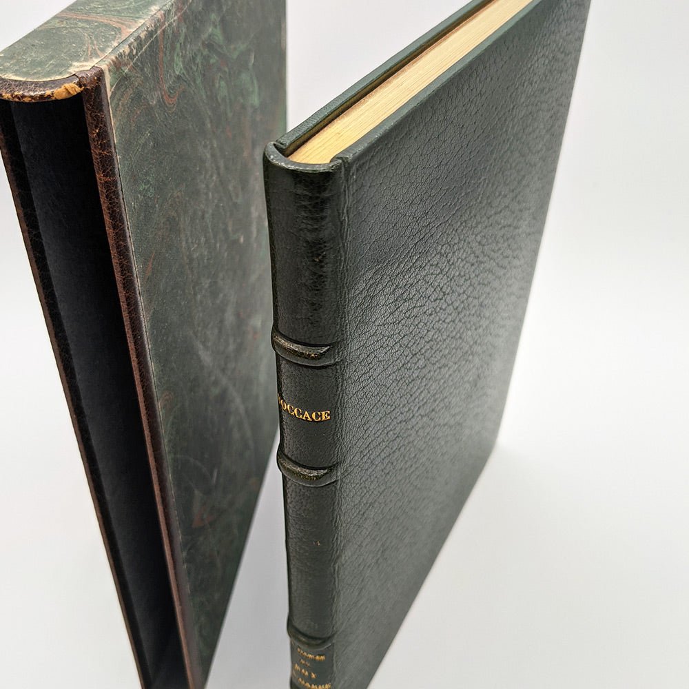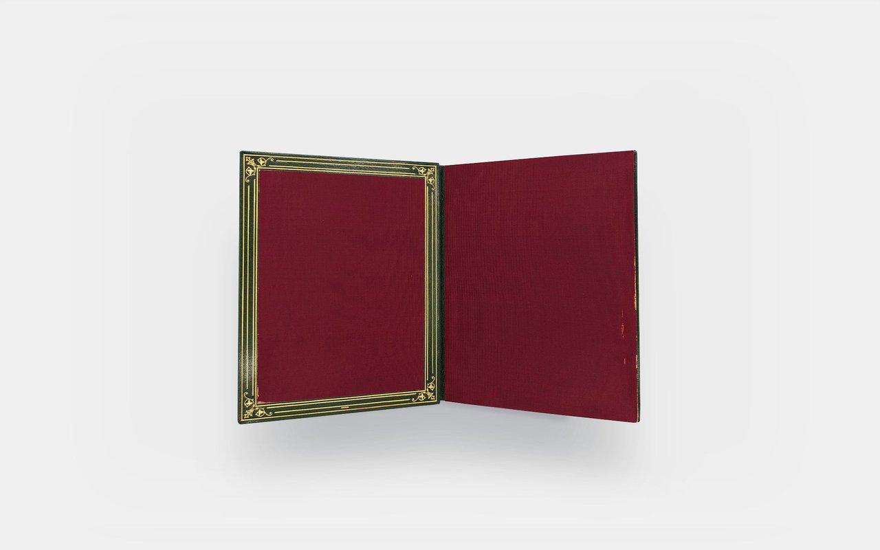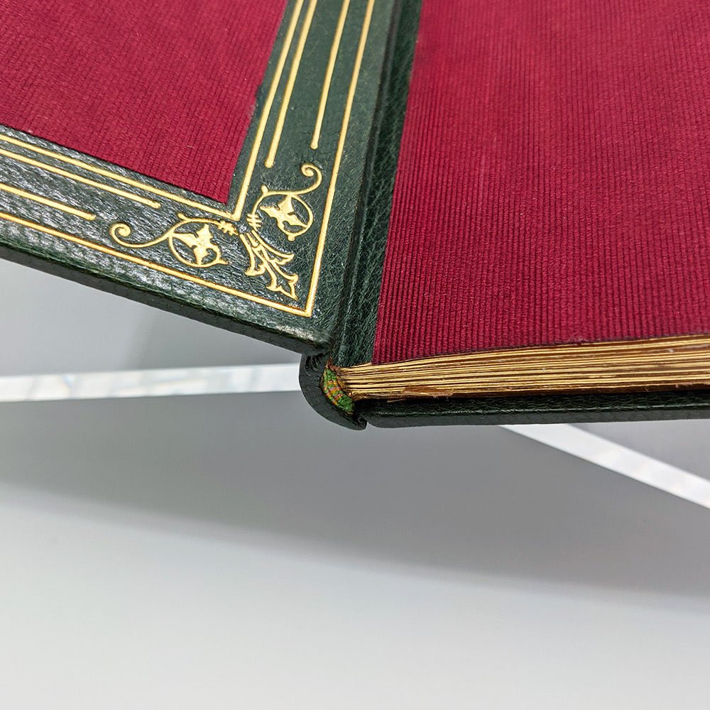 Frame of the interior covers in green morocco decorated with gilded fillets and fleurons, linings and guards in garnet silk, gilded edges, covers and spine preserved, slipcase. Binding signed Meunier.