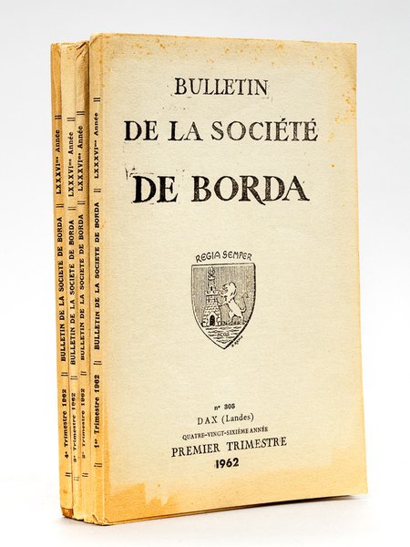 4 vol. in-8 br., Bulletin de la Société de Borda , Dax, 1962, 456 pp. (4 Trimestres en 4 volumes - Année 1962 Complète) [ Contient notamment : ] Les gouverneurs de Dax au XVIe siècle ; Un cadet de Gascogne : Bernard Daudeyos ; Deux séminaristes tarusates du XVIIe siècle ; Jean-Baptiste et Sylvestre Grateloup, graveurs et savants landais ; Remarques sur les mosaïques de l'abbatiale de Sorde ; La charte de concession pour le marché de Peyrehorade ; Nasses et moulins de la Nive inférieure ; Le canal des Pyrénées. Projet de Louis Galabert en 1825 ; L'école pratique d'agriculture de Saint-Sever ; Aux frontières du Béarn, de la Navarre et de la Gascogne (XIIe -XVIe siècles) ; Un curieux pont de l'Adour ; La frontière linguistique du basque et du gascon ; Le problème de l'eau dans les barthes ; Le meurtre de Jean de Bessabat (1585) à Saint-Geours-de-Maremne (etc.) Bon état pour cet exemplaire bien complet des 4 trimestres pour l'année 1962. La société de Borda est un célèbre société savante de Dax, dans les Landes. Elle a été nommée en l'honneur de deux savants du XVIIIe, natifs de Dax : Jean-Charles de Borda (1733-1799) et Jacques-François de Borda d'Oro (1718-1804).
