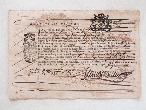 Bureau de Viviers. J'ay reçû des Habitans de Saint Montant [ Saint Montan ] par les mains de Laurans Coulomboy Consul la somme de 600 livres 9 sols et 7 deniers sur ce qu'ils peuvent devoir des deniers Imposez en l'Assemblée générale du Païs du Vivarez tenuë à (illisible) le mois de janvier 1696 tant pour la grande Taille, Cruë, Ayde, Octroy, Garnisons, Mortepayes, Gratifications, frais d'Estats & d'Assiette, Debtes, Estape qu'autres affaires dudit Païs, conformément aux Commissions du Roy & de Nosseigneurs des Etats Généraux de la Province de Languedoc tenus à Montpellier le mois de octobre de ladite anne, de laquelle somme . les quitte & tous autres sans préjudice. Fait à Viviers le vingt-sixièsme jour du mois d'avril 1696"