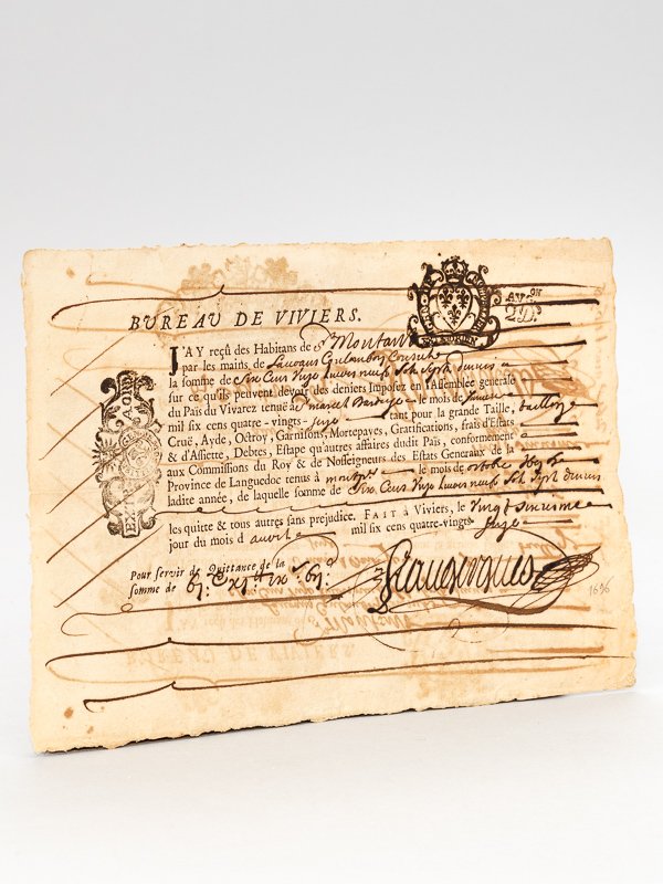 Bureau de Viviers. J'ay reçû des Habitans de Saint Montant [ Saint Montan ] par les mains de Laurans Coulomboy Consul la somme de 600 livres 9 sols et 7 deniers sur ce qu'ils peuvent devoir des deniers Imposez en l'Assemblée générale du Païs du Vivarez tenuë à (illisible) le mois de janvier 1696 tant pour la grande Taille, Cruë, Ayde, Octroy, Garnisons, Mortepayes, Gratifications, frais d'Estats & d'Assiette, Debtes, Estape qu'autres affaires dudit Païs, conformément aux Commissions du Roy & de Nosseigneurs des Etats Généraux de la Province de Languedoc tenus à Montpellier le mois de octobre de ladite anne, de laquelle somme . les quitte & tous autres sans préjudice. Fait à Viviers le vingt-sixièsme jour du mois d'avril 1696" | Livres anciens et modernes | Collectif