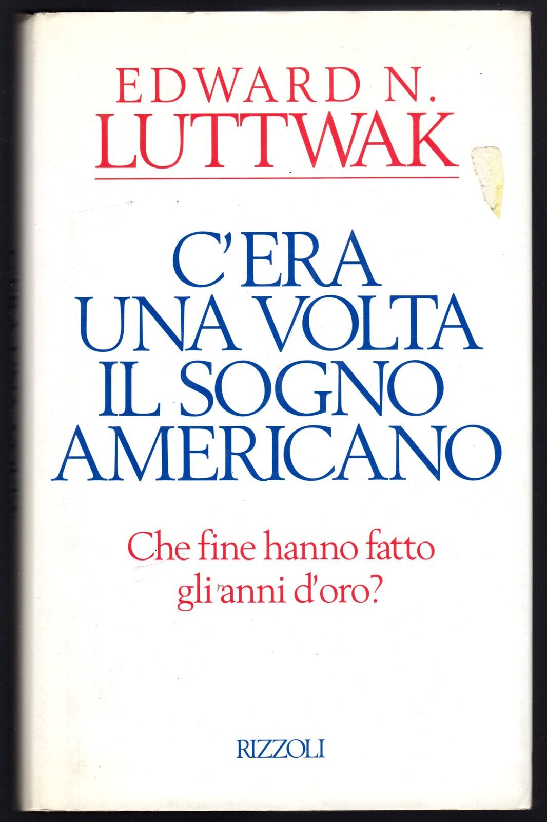 Libro vintage. Argomento: Saggi. Autore: Luttwak Edward N. Editore: Rizzoli. Luogo: Milano. Anno: 1994. Formato: in-8°. Pagg: 394. Legatura: Cartonata. Conservazione: discreta. Dalla bandella: "Edward N. Luttwak dimostra, cifre alla mano, la realtà di un declino ogni giorno più palpabile nella vita quotidiana degli Stati Uniti, puntando l'indice contro il vero colpevole di questo stato di crisi: l'ideologia del libero mercato, relitto di epoche trascorse, immagine speculare, e altrettanto ingannevole, dell'ideologia marxista". Titolo impresso sul dorso, piatto muto. Traduzione di Antonio Bellomi. Prima edizione. Angolo superiore di pagina 57 piegato.
