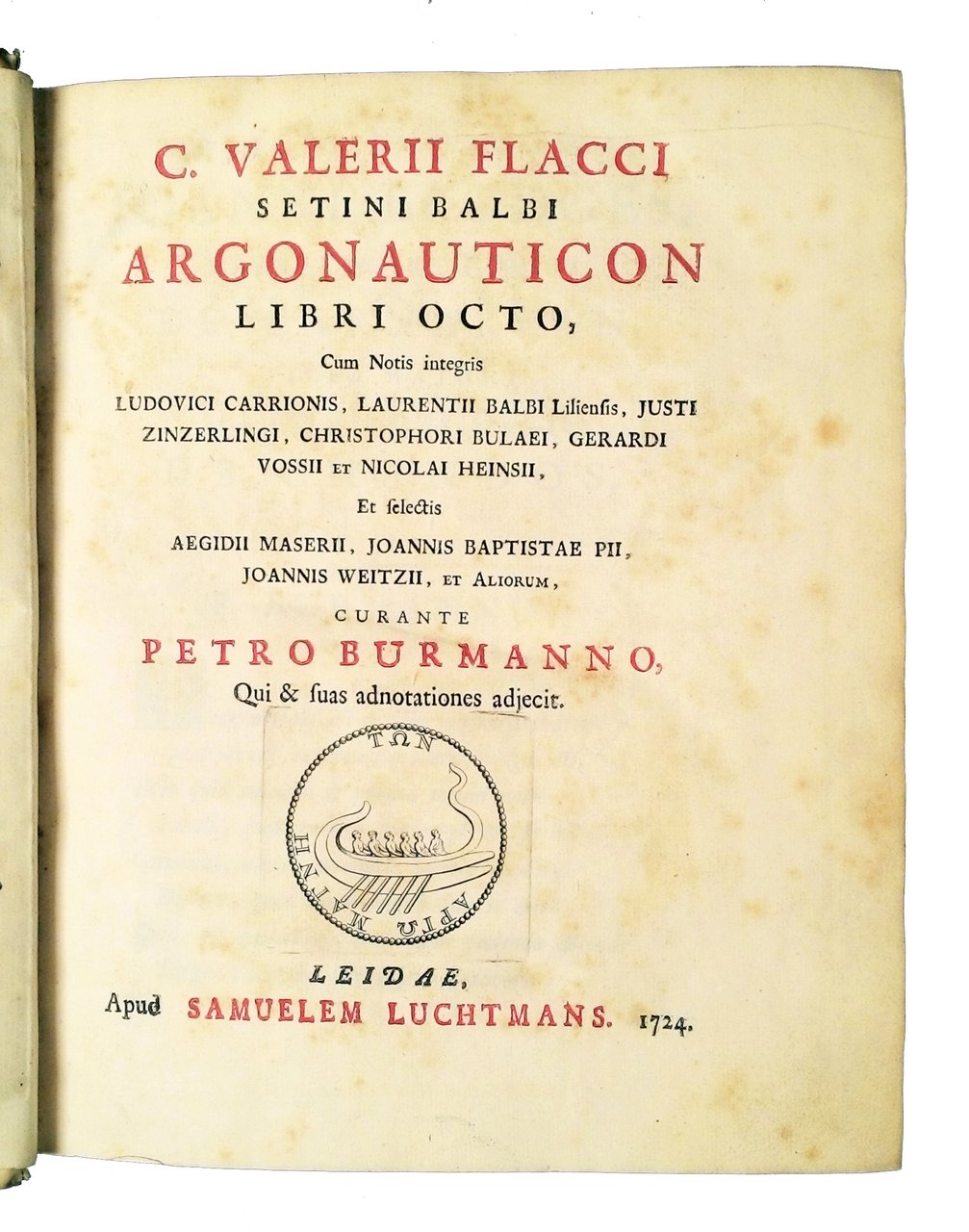 C. Valerii Flacci Setini Balbi Argonauticon libri octo, cum notis integris Ludovici Carrionis, Laurentii Balbi Liliensis, Justi Zinzerlingi, Christophori Bulaei, Gerardi Vossii et Nicolai Heinsii, et selectis Aegidii Maserii, Joannis Baptistae Pii, Joannis Weitzii, et aliorum, curante Petro Burmanno, qui & suas adnotationes adjecit