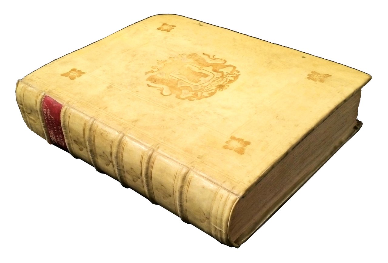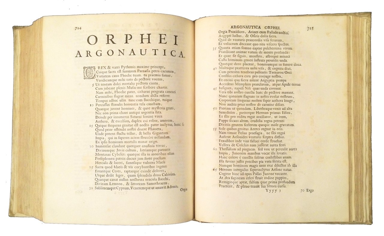 4to (245x198 mm); legatura di pregio in piena pergamena, con stemmi e arme di Alkmaar in oro al centro dei piatti e con quattro decori dorati agli angoli (leggere tracce d'uso ai piatti e mancanza dei lacci); dorso a sei nervi, con decori impressi nelle caselle e titolo in oro su tassello in pelle rossa; pp. [160], 759, [100], [1 b.]; bella antiporta figurata (con firme: "N. v. M. del." e "F. B. fec"), riproducente gli Argonauti circondati da mostri mitologici; marca tipografica al frontespizio, capilettera ornati e testatine finemente incise; frontespizio in rosso e nero, com incisione calcografica, raffigurante gli argonauti su una nave a remi all'interno di un medaglione con motto in greco antico al contorno. Edizione di gran pregio del Luchtmans, a cura di Pieter Burmann (1668-1741; professore di Storia ed Eloquenza a Utrecht e Leida) del poema classico composto in latino da Gaio Valerio Flacco (poeta latino vissuto nel I sec. dopo Cristo durante il tempo di Vespasiano) sul mito di Giasone ed il vello d'oro; questa edizione contiene da p. 684 il "Reliquum octavi libri ex Apollonio Rhodio, Pio Bononiensi auctore", cioè il seguito all'opera incompiuta del Flacco, e comprende anche numerose note sull'opera del Flacco, integrazioni, supplementi e indici dettagliati. Prov.: ex libris su etichetta incollata al contropiatto ant. (Philippe van Heurck); alcune note manoscritte nel testo. Rif.: IT\ICCU\UBOE\001260. OCLC, 213822390. Cond.: Carte fresche; opera completa, quasi in ottime condizioni generali. -- VALUABLE EDITION BY LUCHTMANS OF THE CLASSIC POEM COMPOSED IN LATIN BY GAIUS VALERIUS FLACCUS. Contemp. vellum, gilt coat-of-arms of Alkmaar on covers (sl. rubbed esp. lower cover, ties lacking), 4 single stamps with acorns in corners, gilt spine on 6 raised bands (rubbed), gilt red leather title label (minor spotting). Good copy. Later edition of the classical Latin epic poem on Jason and the Golden Fleece, written by Gaius Valerius Flaccus, a first century c.e. Roman poet. His surviving epic verse work, the “Argonauticon,” describes the quest of Jason and the Argonauts for the legendary Golden Fleece. The work exists in eight books but was left incomplete by the author. This edition of the “Argonauticon” was edited by Pieter Burmann (1668-1741) a professor of History and Eloquence at Utrecht and Leiden. He compiled and included copious notes from previous scholars. Detailed indexes are given in the rear. Burman’s edition also contains the “Supplement of Pius” and the “Argonautica of Orpheus.” Engraved title-page, signed "N. v. M. del." and "F. B. fec", depicting the Argo surrounded by mythical monsters. And printer's mark on title. Title printed in red & black. Ornate woodcut inital capitals and tail-pieces. Bookplate Philippe van Heurck.Fresh leaves; complete copy, in very good condition/quite fine.