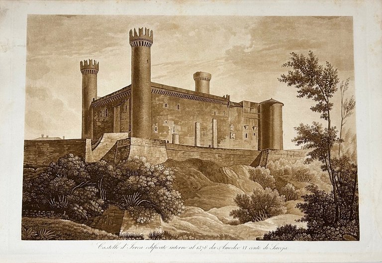 Esempio significativo di architettura militare tardo-medievale piemontese, il complesso fu edificato alla fine del XIV secolo per volontà di Amedeo VI di Savoia (cosiddetto Conte Verde), con funzione difensiva e di controllo strategico sul territorio eporediese. L'incisione è Tratta da, “I Duchi di Savoia. Tavole Genealogiche della Real Casa Savoia. Illustrate coi Monumenti da Pompeo Litta”. Milano, In Casa dell Autore, 1846.