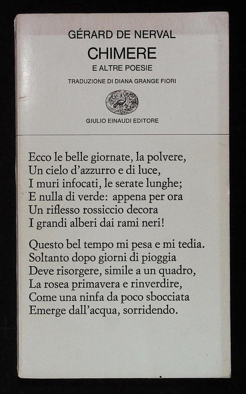 in 16° bross. ed. pp. 212 coll. Collezione di poesia n° 96 Testo a fronte in francese. Introduzione e traduzione di Diana Grange Fiori. Leggeri segni del tempo al piatto della coperta, altrimenti in ottimo stato (A56)