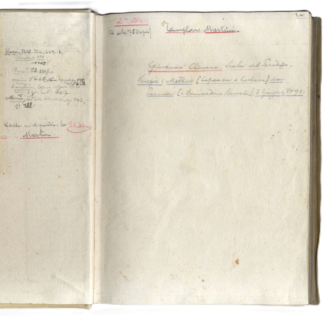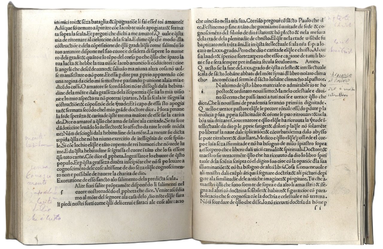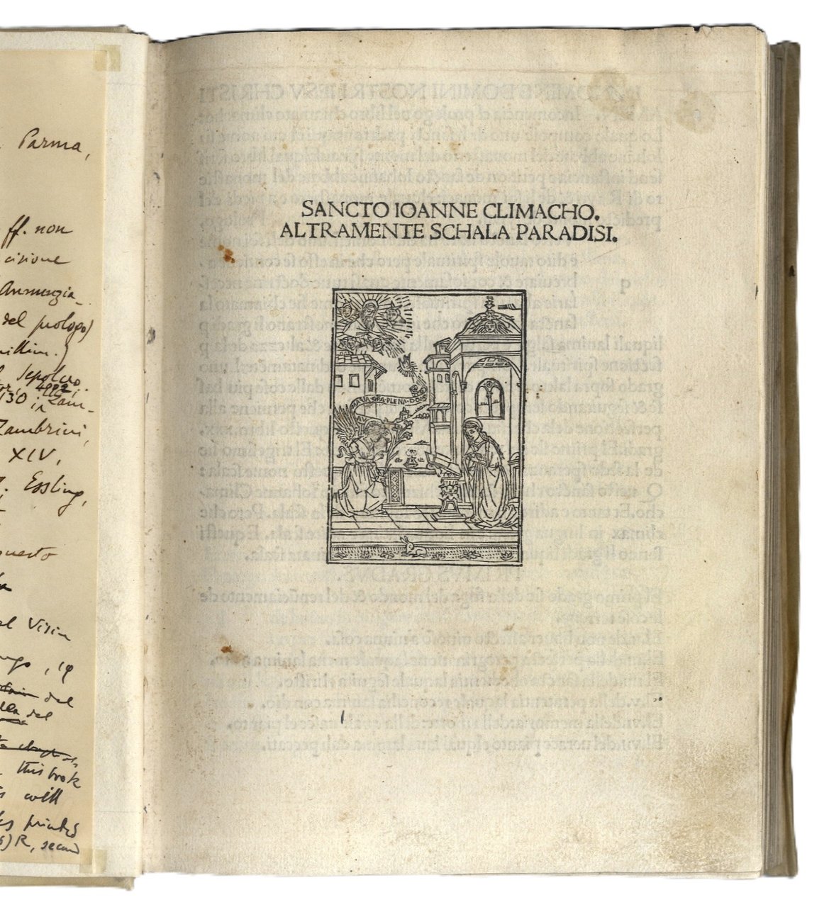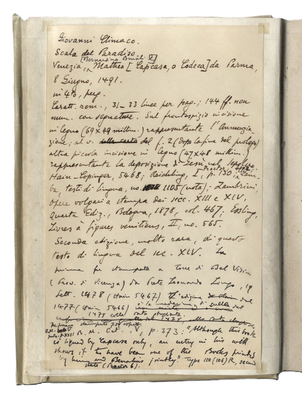 >in-4, (210x150 mm), ff. 144 n.n., legatura posteriore in p. pergamena. Illustrato da due artistiche incisioni in legno (mm 480x500 circa caduna): "Annunciazione" (sul titolo) e "Deposizione di Cristo Morto" (al verso del secondo f.). Seconda edizione della traduzione in italiano (prima Torrebelvicino presso Vicenza, Leonardo Longo, 1478; quella del 1477 citata dall'Hain 5466 non esiste) di questa famosa guida spirituale, «Klimax tou Paradeisou» o Scala del Paradiso, composta in greco nel VII secolo da San Giovanni soprannominato Climaco, ovvero «quello della scala», dal nome appunto del suo componimento. Vera e propria sintesi della tradizione monastica antica, illustra, attraverso trenta gradini, altrettante tappe della vita monastica. La "Scala del paradiso" venne tradotta in molte lingue, tra cui latino, siriaco, armeno, arabo e slavo. Sulla base della traduzione latina di Angelo Clareno da Cingoli, nel XIV secolo l'agostiniano Gentile da Foligno la traspose in italiano. Buon esemplare di raro incunabolo (sporadiche note ms. ai margini e in fine), censito solamente in una decina di Biblioteche nel mondo. Di illustre provenienza: appartenuto al celebre libraio e collezionista Giuseppe Martini, con sue note manoscritte nel suo inconfondibile stile calligrafico, a lapis e con sottolineature in rosso e blu, alle sguardie anteriori. Martini (1870-1944), attivo a Lucca, New York e Lugano nei primi decenni del Novecento, ebbe il merito di diffondere l'erudizione e la bellezza, oltre a venderle, attraverso i magnifici libri che trattava. Come in questo caso, era solito apporre le indicazioni bibliografiche a lapis sui fogli di risguardo oppure applicare sul contropiatto la scheda a penna su cartoncini. I grassetti o i corsivi evidenziati a matita rossa o blu, per indicare al compositore il carattere da utilizzare per il catalogo. CATALOGO MARTINI 188. BMC,V, 373: «Sebbene questo libro porti soltanto il nome del Capcasa tuttavia un passo del suo testamento prova che è uno di quelli stampati in società col Benali; l’edizione fu limitata a 750 copie» IGI 5215. ESSLING 565. SANDER 2018. GAMBA, 1105 (nota); ZAMBRINI, OPERE VOLGARI, 467.