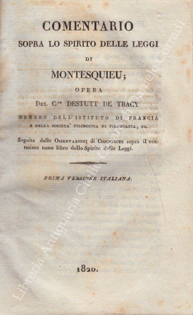 Comentario sopra lo spirito delle leggi di Montesquieu; Opera. Seguita dalle Osservazioni di Condorcet sopra il ventesimo nono libro dello Spirito delle Leggi. Prima versione italiana | Livres anciens et modernes | Destutt De Tracy Antoine Louis Claude (1754-1836)