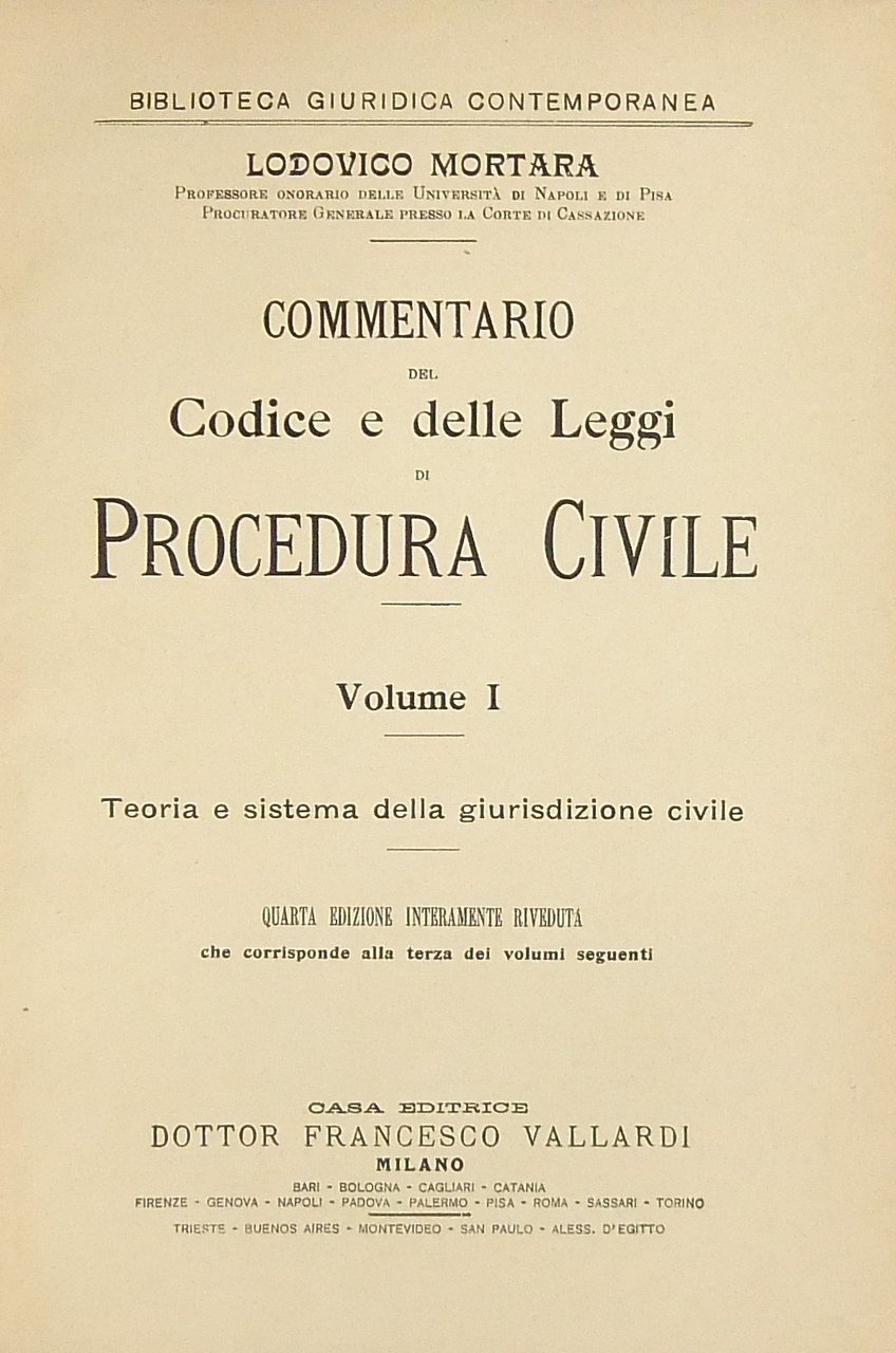 Commentario del Codice e delle Leggi di Procedura Civile. Vol. I - Teoria e sistema della giurisdizione civile. Vol. II - Della competenza. I principii generali della procedura. Vol. III - La conciliazione. Il compromesso. Il procedimento di dichiarazione in prima istanza. Vol. IV - Il procedimento di dichiarazione in prima istanza (fine). I mezzi per impugnare le sentenze. Vol. V - Dell'esecuzione forzata sui beni. Dei procedimenti speciali