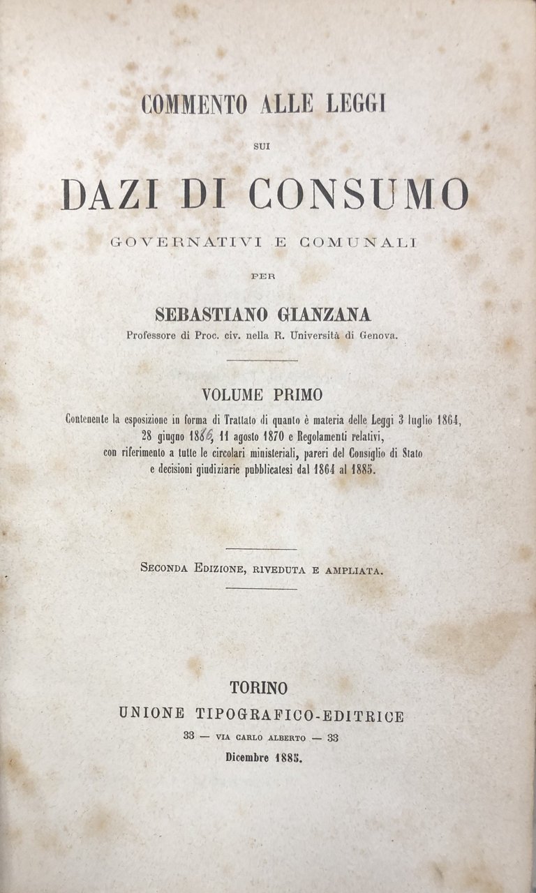 Commento alle leggi sui dazi di consumo governativi e comunali | Livres anciens et modernes | Gianzana Sebastiano