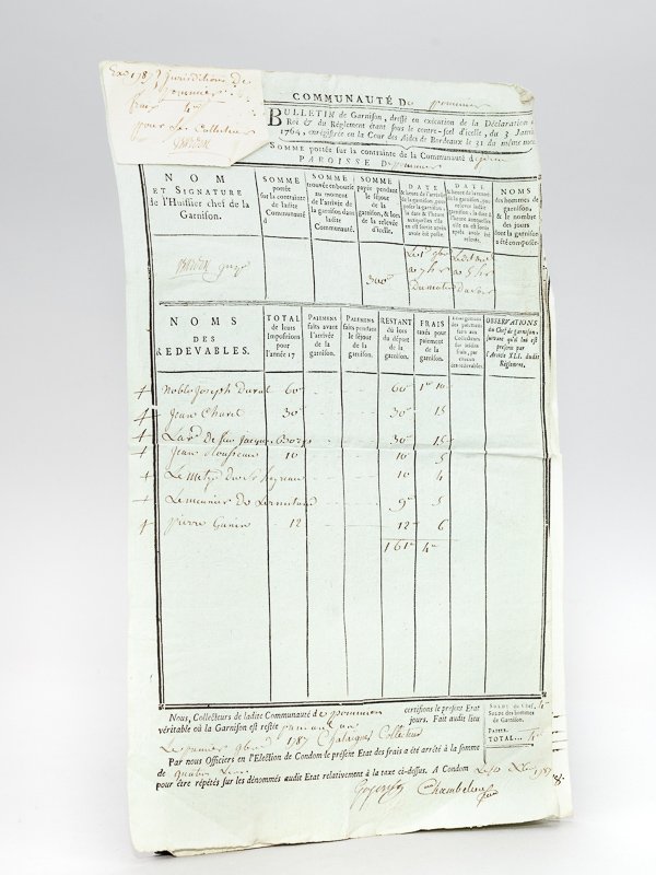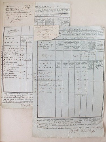 Rappel du titre complet : Communauté de Pommiers. Bulletin de Garnison, dressé en exécution de la Déclaration du Roi & du Réglement. du 3 Janvier 1764, enregistré en la Cour des Aides de Bordeaux [ 2 Bulletins de Garnison datés du premier novembre 1787 puis du 26 décembre 1787, à Pommiers, dans le Condomois ] Intéressants documents témoignant des procédés de contrainte communément utilisé par les collecteurs de taxes, usant des garnisaires. On relève les noms des redevables suivants : Noble Joseph Duval, Jean Chavet, Jean Moufreau, Le Metyr du Sr. Heyreau, Pierre Ganier, etc. (15 noms pour le second bulletin contre 7 dans le premier).