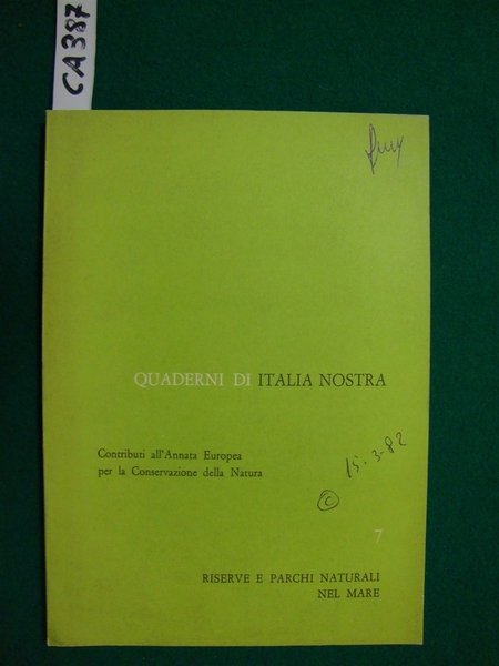 (Collana : Quaderni di Italia nostra - n. 7) Con questo Quaderno, il 7° della serie, a cui hanno collaborato numerosi esperti coordinati dal Dr. Longino Contoli del CNR, Italia Nostra vuole dare una visione generale, per quanto riguarda l'Italia, del problema della creazione di Riserve e Parchi naturali per la difesa del mare, e fornire, tra le altre possibilità di intervento attivo, una serie di suggerimenti al riguardo - DETTAGLIO DELLE CONDIZIONI : Firma di originaria appartenenza in coperta - (26f).