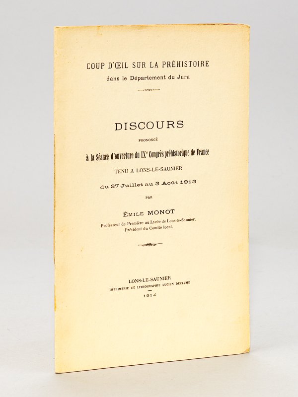 Coup d'oeil sur la Préhistoire dans le Département du Jura. Discours prononcé à la Séance d'ouverture du IXe Congrés préhistorique de France tenu à Lons-le-Saunier du 27 juillet au 3 août 1913 | Livres anciens et modernes | Monot, Emile [1864-1944]