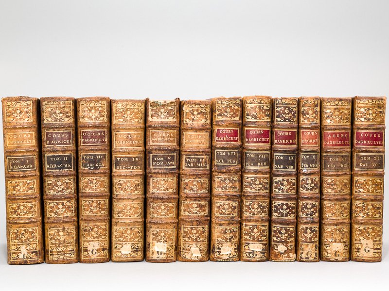 12 vol. in-4 reliure pleine basane marbrée, dos à 5 nerfs orné, Tome I : Rue et Hôtel Serpente, 1781, 1 f., VI pp., 1 f., 704 pp. avec 21 planches et 2 tableaux dépliants ; Tome II : Rue et Hôtel Serpente, 1782, 4 ff., 680 pp. avec 27 planches ; Tome III : Rue et Hôtel Serpente, 1783, 3 ff., 685 pp. avec 20 planches ; Tome IV : Rue et Hôtel Serpente, 1783, 2 ff., 692 pp. et 1 f. n. ch., avec 11 planches ; Tome V : Rue et Hôtel Serpente, 1783, 3 ff., 747 pp., avec 31 planches ( y compris 2bis et 15bis) ; Tome VI : Rue et Hôtel Serpente, 1785, 2 ff., 735 pp. avec 24 planches ; Tome VII : Chez Delalain Fils, Paris, An IX, 1801, 2 ff., 760 pp. avec 20 planches (les deux planches XX et XXI du tome 7) ; Tome VIII : Chez Delalain et Fils, Paris, 1789, 2 ff., 709 pp. avec 42 planches (il y a deux XX et XXI du tome 7) ; Tome IX : Chez Moutardier, Paris, An IX, 1801, 2 ff., 608 pp. avec 18 planches (il y a deux planches 9) ; Tome X : Chez Moutardier, Paris, An X, 1802, 2 ff., xvj-463 pp. avec 30 planches (il y a deux planches 27) et 4 tableaux dépliants ; Tome XI : Chez Marchant, Drevet, Crapart, Caille et Ravier, Paris, 1805, 2 ff., LVI-492 pp. avec 15 planches et 3 grands tableaux dépliants ; Tome XII : Chez Marchant, Drevet, Crapart, Caille et Ravier, Paris, 1805, 2 ff., 663 pp. avec 10 planches et un tableau dépliant. Titre complet (au tome premier) : Cours Complet d'Agriculture Théorique, Pratique, Economique, et de Médecine Rurale et Vétérinaire (12 Tomes - Complet) Suivi d'une Méthode pour étudier l'Agriculture par Principes : ou Dictionnaire Universel d'Agriculture Rare exemplaire bien complet, contenant 269 planches, ainsi que 10 tableaux dépliants. Bon ensemble (qq. accrocs et petits mq. en coiffes, qq. accrocs et frott. en plats et coupes, anciennes étiquettes de cote au dos en queue, très bon état intérieur général) pour cet exemplaire bien complet du monument de l'agronomie française du siècle des Lumières. Après la mort de l'Abbé Rozier en 1793, la publication fut continuée par Chaptal, Lasteyrie, Parmentier et d'autres (tome 10) puis dirigée par Thouin (tomes 11 et 12).