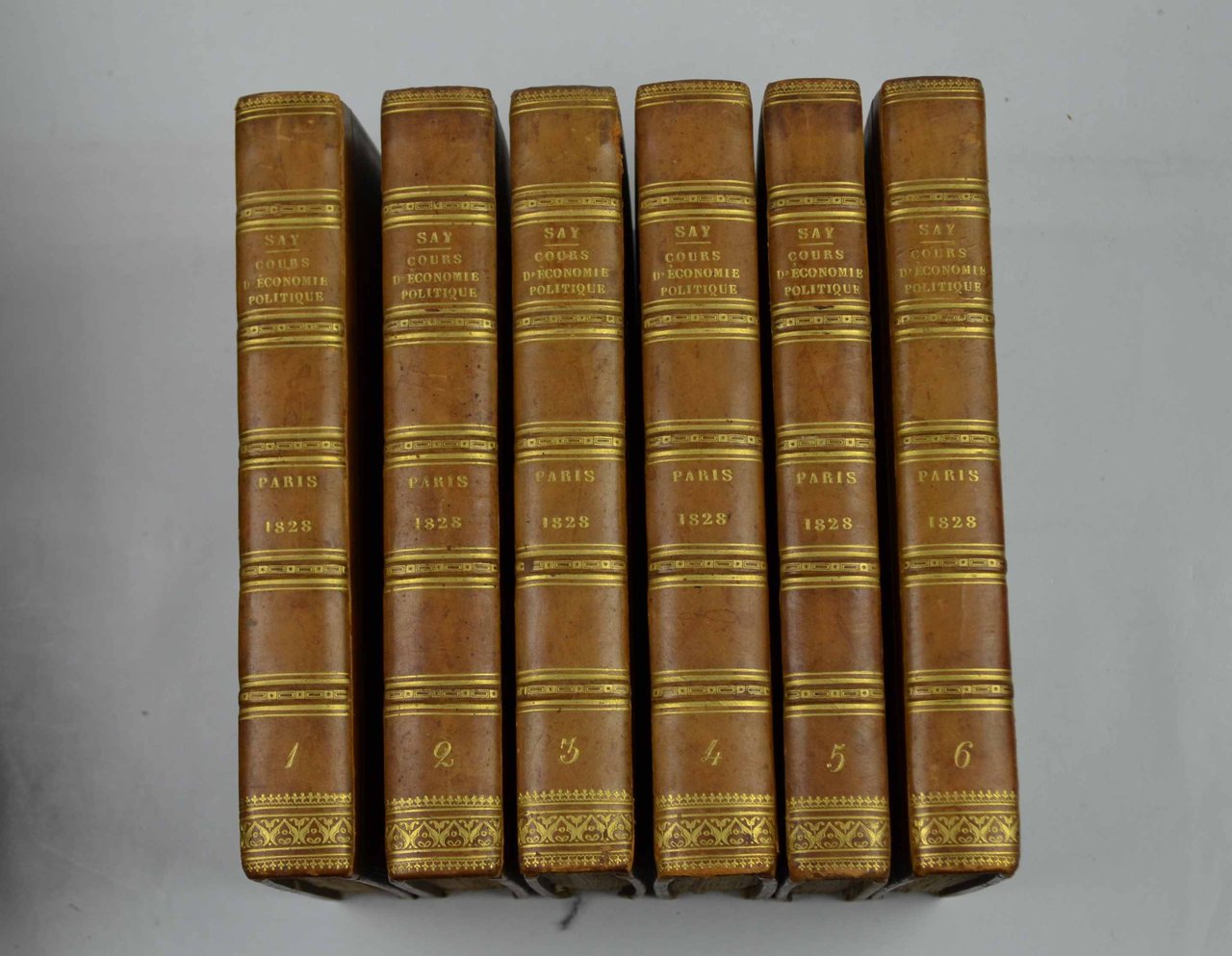 Sei volumi di cm. 21,5, pp. 3.000 ca. complessive. Una tabella ripiegata nel primo volume. Solida ed elegante legatura coeva in mezza pelle, dorsi a nervi con titoli, fregi e filetti in oro. Esemplare marginoso e ben conservato, con pochi segni d'uso e qualche minima spellatura al margine dei piatti. Edizione originale.