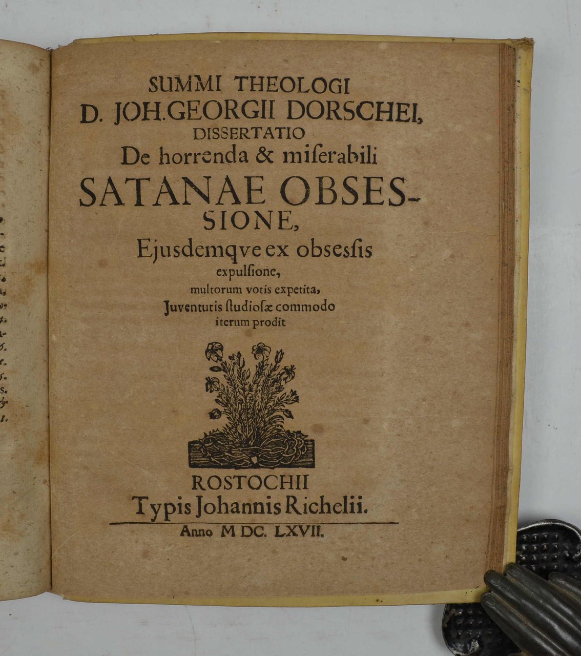Pp. (8) 211 (1). Unito a: DORSCHE J.G. Dissertatio de horrenda & miserabili Satanae obsessione, ejusdemque ex obsessis expulsione, multorum votis expetita, cujus nunc in juventutis studiosae commodum prodit. Rostochi, typis Johannis Richelii, 1667. Pp. (48). Due opere in un volume di cm. 19, legatura del tempo in piena pergamena rigida con titoli ms. sl dorso. Fregi xilografici ad entrambi i frontespizi. Testo uniformemente brunito, peraltro genuino ed in buono stato di conservazione.
