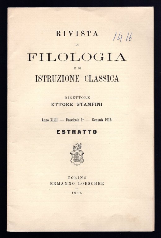 Opuscolo vintage in-8° con 11 pagg, FIrenze, 1915. Saggi. Testo in lingua latina. Estratto dalla Rivista di Filologia e d'Istruzione classica - Anno CLIII - Fascicolo I. Segno di piegatura verticale. Note a biro in copertina.