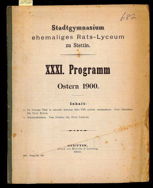 Opuscolo vintage in-8° con 29 pagg, Stettin, 1900. Saggi. Testo in lingua latina. Note a biro in copertina. Segno di pieagtura verticale. Strappetti.