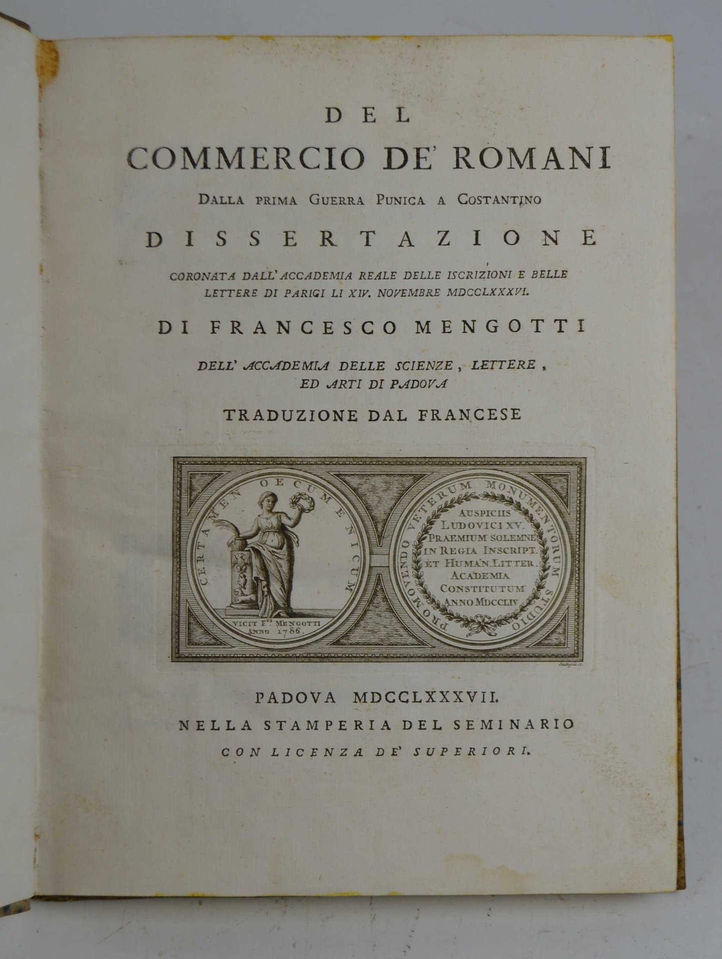 Cm. 26, pp. (4) cxiii (1) + 1 carta bianca. Grande vignetta incisa in rame al frontespizio ed alcuni eleganti fregi xilografici nel testo. Leg. di poco posteriore in cart. rigido con titoli ms. al dorso. Qualche alone limitato alla carta di ricoperura dei piatti, peraltro bell'esemplare, in ottimo stato di conservazione. Francesco Mengotti (1749-1830) di Fonzaso (Belluno) fu erudito e scienziato di fama; ricoprì le cariche di Senatore del Regno Italico e di Primo Consigliere di Governo a Venezia. Edizione originale, non comune, di quest'opera storica sull'espansione imperiale romana in relazione siprattutto alle sue attività commerciali.