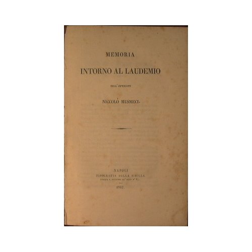 In 8° - pp.pp.171+ 3nn + 2b ; 74 - Cartonata editoriale - Due volumi in un tomo - Qualche fioritura alle pagine del volume ' Memoria intorno a laudemio' - Rilegato nello stesso volume: Memoria intorno al laudemio dell'avvocato Niccolò Musmeci - Napoli - Tipografia della Sibilla - 1847