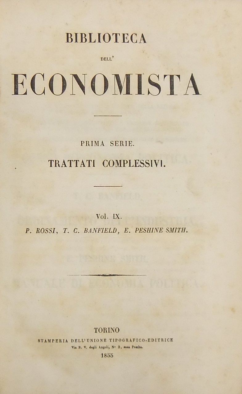 Del metodo in economia politica della natura e definizione del lavoro (Rossi). Osservazioni sul diritto civile francese considerato nei suoi rapporti collo stato economico della società (Rossi). Introduzione alla storia delle dottrine economiche (Rossi). Corso di economia politica (Rossi). Ordinamento dell'industria (Banfield). Manuale di economia politica (Peshine Smith). Introduzione di Francesco Ferrara