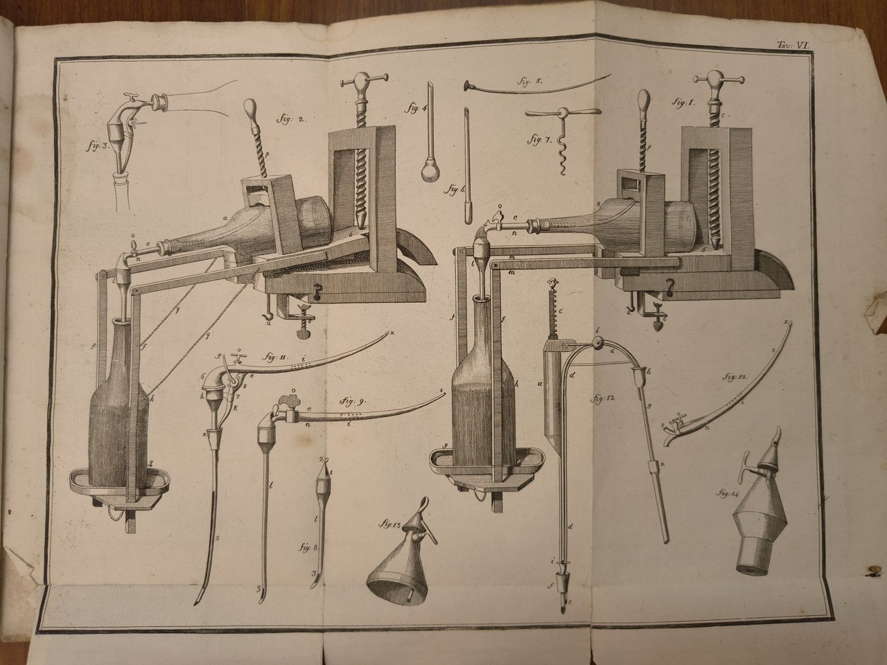 1821. Copertina editoriale coeva. In-8°, 140 pagg. num. incluso il frontespizio, IX pagg. num.; 1 tavola ripiegata incisa su rame con 14 figure raffiguranti relativi attrezzi come imbuti, apparecchi per imbottigliare, sifoni, ecc.; 21 cm. Rara edizione originale, pubblicata postuma, di questo interessante saggio dell'illustre enologo il conte Vincenzo Dandolo (*Venezia 1758 - †Varese 1819), cui si deve la moderna impostazione delle tecniche di vinificazione nel nostro paese. Segni del tempo in copertina con lacerazioni, tagli e scolorimenti come da foto. Rare efflorescenze e piccole barbe. Legarura lenta. Condizioni generali buone.