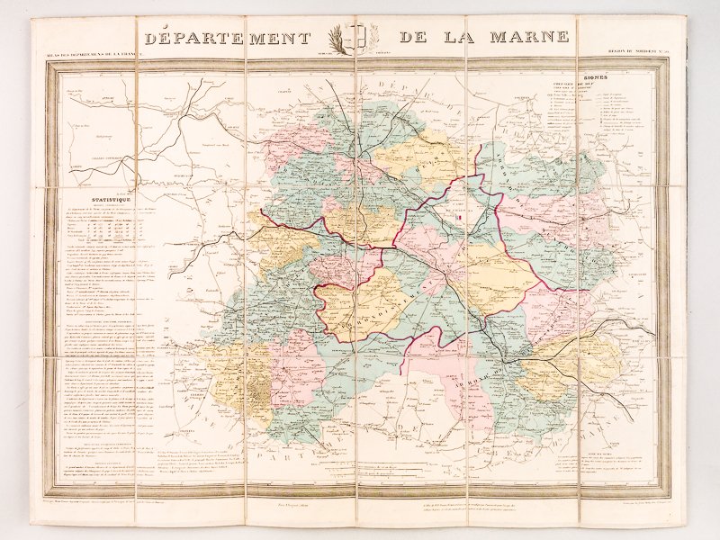 Dressé par Alexis Donnet, Ingénieur géographe, Revu et rectifié par Ernest Grangez, gravé par les frères Malo, 1 carte entoilée en couleur dépliante format 55,5 x 70 cm. sous chemise et étui, Atlas des Départemens de la France de Donnet, Frémin et Levasseur, A. Logerot Paris, Lanée, Successeur de Longuet, s.d. [ circa 1852 ] Jolie carte en couleurs entoilée du département de la Marne (étui abîmé, bon exemplaire par ailleurs).