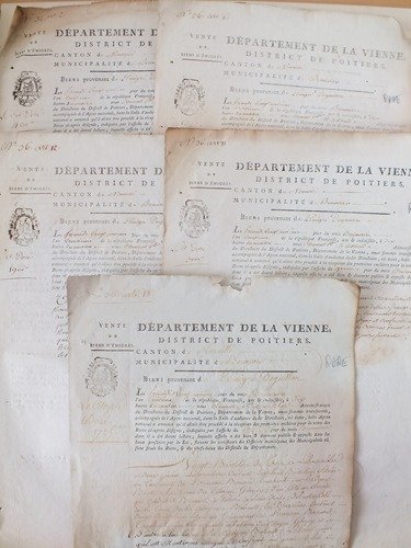 Rappel du titre complet : Département de la Vienne. District de Poitiers Canton de Nouaillé, Municipalité de Beauvoir. Vente de Biens d'Emigrés [21 Brumaire An III : Lot de 5 Documents ]. Biens provenant de l'Emigré Deguillon [ A savoir : ] Les Bastimens de la métairie appelée la Rouartinière, consistant en une chambre Basse petite Chambre à côté, Grenier par dessus, . plus La Borderie appellée la Boissonnerie, . plus une pièce de pré - Divers Terrains - Métairie appelée la Prévôté, etc. Suite à la vente à la bougie, l'adjudication s'effectue en faveur de Paul Thimotée doré Agent National de Beauvoir, pour respectivement 4200, 3200, 1725, 3000 et 1900 Livres. Etat satisfaisant (mouill. en milieu du document) pour ces intéressantes expéditions (copies) de l'époque