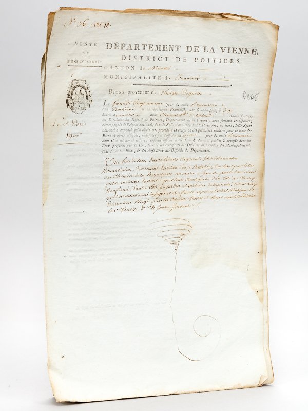 Département de la Vienne. District de Poitiers Canton de Nouaillé, Municipalité de Beauvoir. Vente de Biens d'Emigrés [21 Brumaire An III : Lot de 5 Documents ]. Biens provenant de l'Emigré Deguillon [ A savoir : ] Les Bastimens de la métairie appelée la Rouartinière, consistant en une chambre Basse petite Chambre à côté, Grenier par dessus, . plus La Borderie appellée la Boissonnerie, . plus une pièce de pré - Divers Terrains - Métairie appelée la Prévôté, etc. | Livres anciens et modernes | Département De La Vienne, Administrateurs Composant Le Directoire Du District De Poitiers