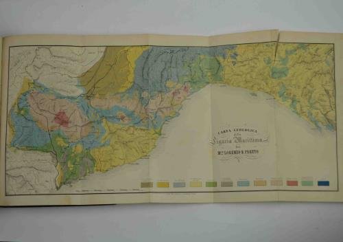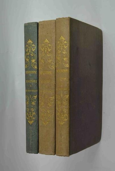 Tre volumi di cm. 27, pp. xiv, 182, 180; (4) 542; (4) 354 (2). Stemma inciso a ciascun frontespizio e 25 tavole fuori testo anche ripiegate. Tra queste la carta topografica del Golfo di Genova e la carta geologica della Liguria marittima (a colori), alcune di interesse scientifico con rappresentazioni di molluschi e uccelli, altre di scorci e monumenti della città di Genova. Bella ed elegante leg. edit. in tela zigrinata con titoli e fregi romantici ai dorsi (in tonalità marroncino per i primi due volumi e verde per il terzo). Manca, come quasi sempre, la carta di Genova allegata al secondo volume. Alcune tavole con un'uniforme brunitura, peraltro bell'esemplare, in ottimo stato di conservazione.