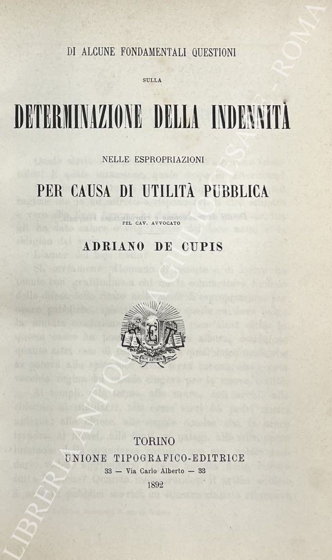 Di alcune fondamentali questioni sulla determinazione della indennità nelle espropriazioni per causa di pubblica utilità | Livres anciens et modernes | De Cupis Adriano