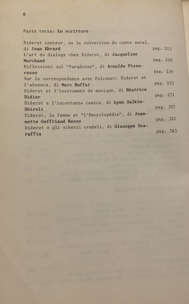 Raccolta di saggi di vari autori italiani e stranieri sulla figura del Diderot, suddivisi nel Diderot politico, il filosofo e lo scrittore. La raccolta contiene scritti di ben 18 autori. Particolare il carattere utilizzato per la stampa che richiama i testi dattiloscritti - DETTAGLIO DELLE CONDIZIONI : Tracce d'umido al dorso ed alla coperta che la danneggiano. Interni perfettamente conservati e non segnati - .