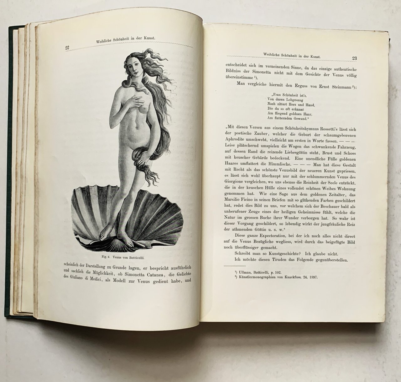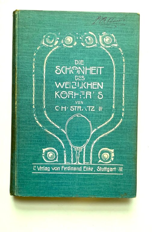 X ed. (Zehnte Auflage): (ed. originale: 1898). Testo in tedesco. VIII/ 336/ rilegatura rifinita in tela verde salvia con titoli e ornati in bianco. Fogli di guardia in carta marmorizzata nei toni del verde. Ex libris con incisione in nero "Dant vulnera formam" applicato al primo foglio di guardia (disegno di A M). Mit 180 theils farbigen Abbildungen im Text, 5 Tafeln in Heliogravüre und 1 Tafel in Farbendruck. Stato buono (leggera usura della copertina ai margini - copertina brunita al dorso - firma di possesso ad inchiostro seppia al primo piatto della copertina e in frontespizio - pagine brunite e con fioriture). Inhalt: Vorwort; C. H. Stratz (den Haag-Scheveningen, Juni 1898) - Vorwort zur dritten Auflage; C. H. Stratz (den Haag, Mai 1899) - Vorwort zur siebenten Auflage; C. H. Stratz (den Haag, 18. Januar 1900) - Vorwort zur zehnten Auflage; C. H. Stratz (den Haag, 1. Januar 1901) - Eintelung - Der moderne Schönheitsbegriff - Darstellung weiblicher Schönheit durch die bildende Kunst - Weibliche Schönheit in der Literatur - Proportionslehre und Canon - Einfluss der Entwickelung, Ernährung und Lebensweise auf den Körper - Einfluss von Geschlecht, Lebensalter und Erblichkeit - Einfluss von Krankheiten auf die Körperform - Einfluss der Kleider auf die Körperform - Beurtheilung des Körpers im allgemeinen nach diesen Gesichtspunkten - Beurtheilung der einzelnen Körpertheile (Kopf - Rumpf (Der Rumpf als Ganzes - Die einzelnen Theile des Rumpfes (Brust - Bauch - Rücken) - Die Verbindungen des Rumpfes mit Kopf und Gliedmassen (Hals - Schultern - Hüften und Gesäss)) - Obere gliedmassen (Arm Hand) - Untere Gliedmassen (Bein Fuss)) - Ueberblick der gegebenen Bedingungen normaler Körperbildung (Masse und Proportionen. Fehler und Vorzüge) - Schönheit der Farbe - Schönheit der Bewegung (Stellungen der ruhenden Körpers (Streckung des Rumpfes - Begungdes des Rumpfes - Drehung des Rumpfes - Die Aufrechte Stellung Die sitzende Stellung - Die liegende Stellung) - Stellungen des bewegten Körpers) - Praktische Verwethgung der wissenschaftlichen Auffassung weibliccher Schönheit - Verwerthung in der Kunst und Kunstritik. Modelle - Vorschriften zur Erhaltung und Förderung weiblicher Schönheit.