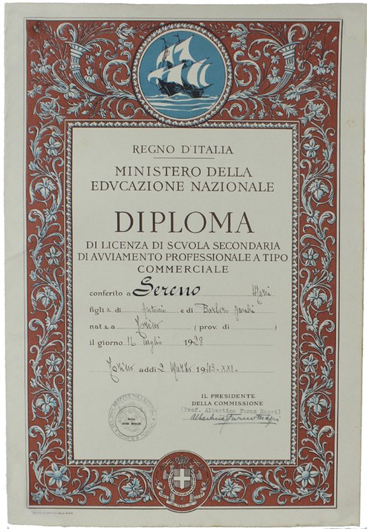 DIPLOMA DI LICENZA DI SCUOLA SECONDARIA - TORINO 1943 | Livres anciens et modernes |