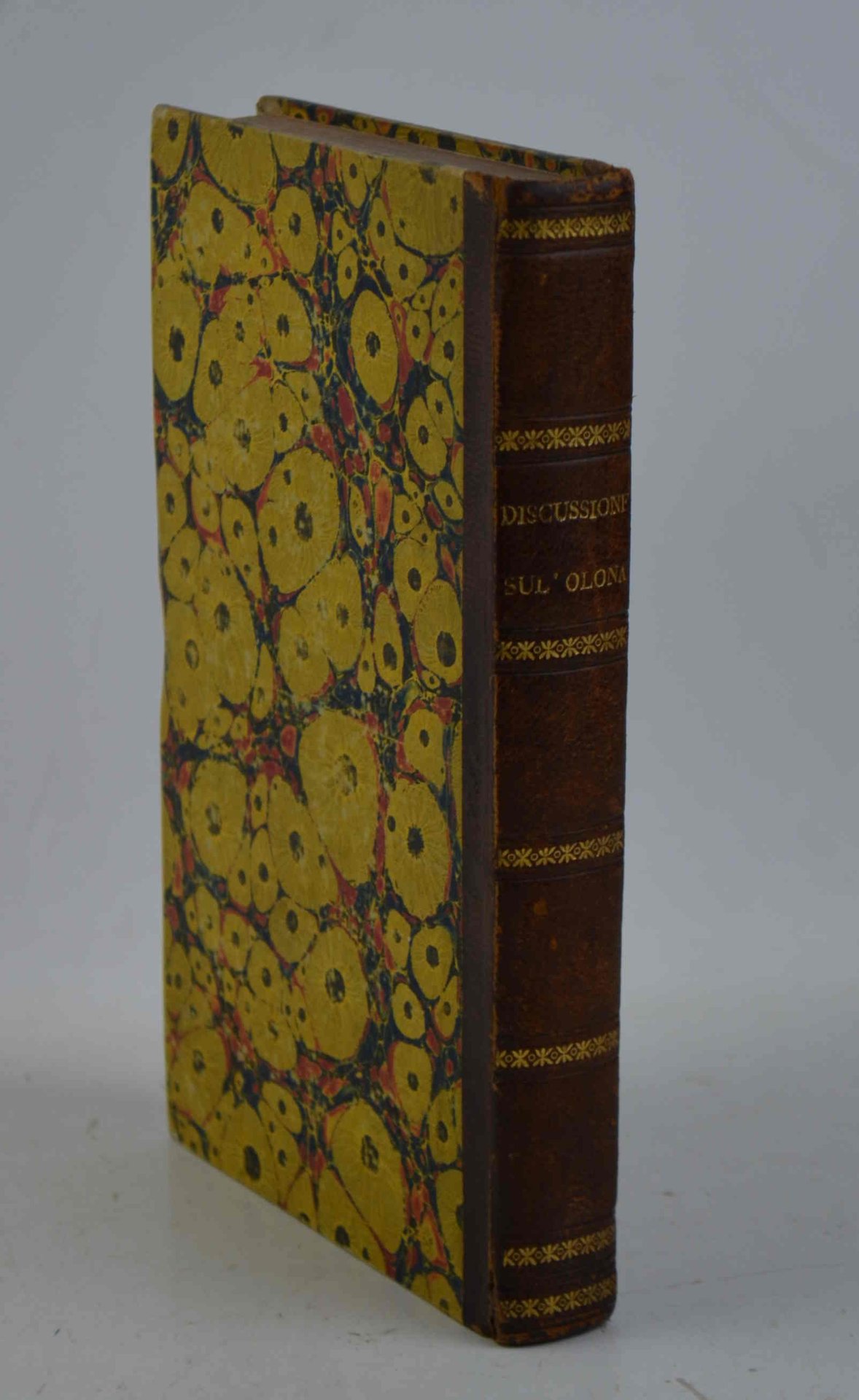 Cm. 19,5, pp. xvi, 295 (3). Solida legatura coeva in mezza pelle, dorso liscio con titoli, filetti e fregi in oro. Esemplare genuino e ben conservato. Non comune edizione originale di quest'opera testo che nasce nel fervore di studi statistici del periodo napoleonica. Gioia studia dal vivo l'agricoltura, il commercio, l'industria, la popolazione di questa zona compresa tra Ticino, Po, Adda. Cfr. Pecchio, p. 267.