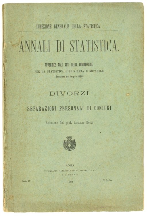 DIVORZI E SEPARAZIONI PERSONALI DI CONIUGI. Annali di Statistica, appendice agli Atti della Commissione per la Statistica Giudiziaria e Notarile. | Livres anciens et modernes | Bosco Augusto.