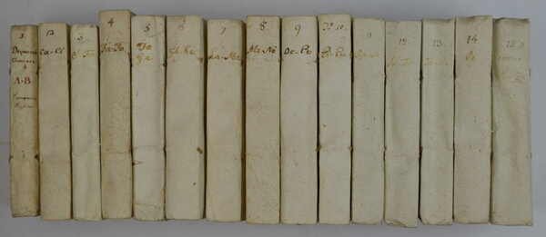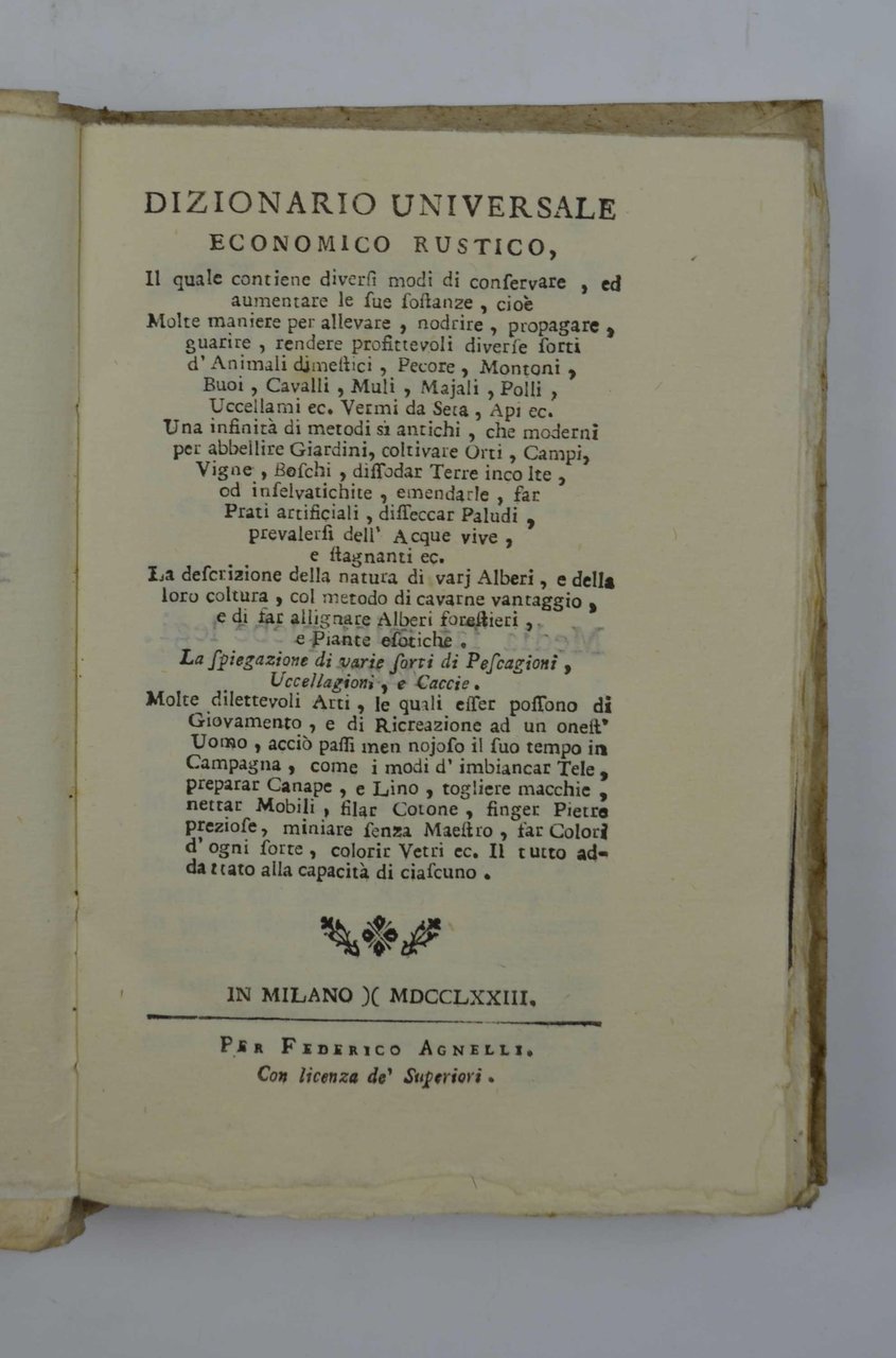 Quindici volumi di cm. 19, pp. 6.000 ca. complessive. Ottima legatura coeva in cart. alla rustica con nervi passanti. Esemplare particolarmente fresco e ben conservato. Marginoso ed in barbe. Prima edizione di questa vasta enciclopedia che tratta di ogni aspetto dell'economia rurale, con dettagliate informazioni delle pratiche di allevamento, della coltivazione di giardini, orti e vigne, nonché descrizioni di alberi e piante esotiche, tecniche di pesca e caccia. Cfr. Ceresoli (p. 251): "In questo dizionario i nomi degli uccelli, dei quadrupedi da caccia e dei pesci sono seguiti dalla descrizione dell'animale e del modo di cacciarlo o prenderlo. Gli attrezzi per la caccia e per la pesca e i metodi di Aucupio vi sono ampiamente descritti". Opera rara, soprattutto in tale, impeccabile stato di conservazione.