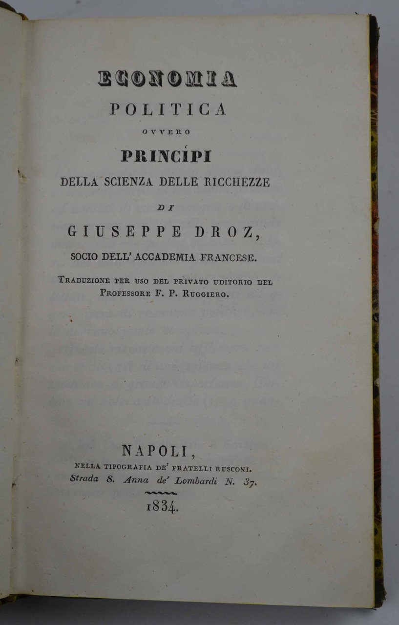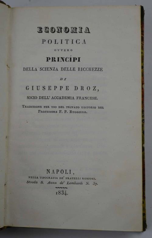 Economia politica ovvero principi della scienza delle ricchezze… Traduzione per uso del privato uditorio del Professore F.P. Ruggiero. | Livres anciens et modernes | DROZ FRANCOIS XAVIER JOSEPH.