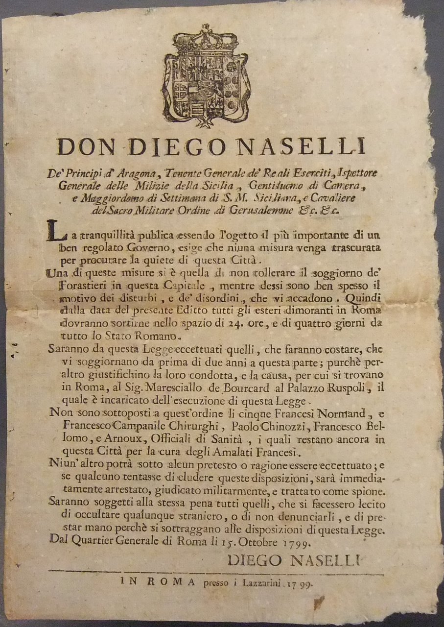 Editto Don Diego Naselli. Per assicurare la tranquillità della popolazione i forestieri devono abbandonare Roma ad eccezione di coloro che vivono in città da più di due anni