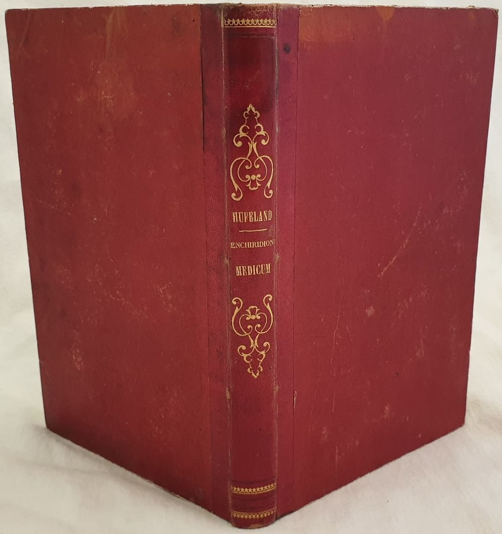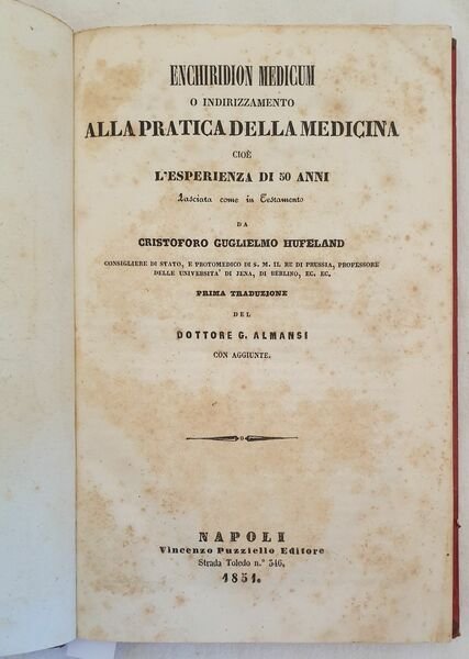 Edizione del 1851 di questo manuale pratico di medicina del celebre medico tedesco Christoph Wilhelm Hufeland (1762-1836). Hufeland fu il promulgatore della medicina olistica secondo il modello di Ippocrate. Utilizzò l'idroterapia e le cure termali. All'interno: Natura e arte fisiatrica, Febbri acute o continue, croniche ed intermittenti, Infiammazioni e congestioni sanguignem reumatismi, Nevrosi o malattie dei nervi, Emaciazioni, Profluvi, Ritenzioni, Esantemi, Parassiti, discrasie ecc. Alla fine trattarello dello stetoscopio. L'opera è in un volume ed è completa. In buone condizioni. Copertina in mezza pelle con titolo e decorazioni in oro al dorso in buone condizioni con lievi usure ai margini e dorso. Legatura in buone condizioni. Pagine in buone condizioni con fioriture. In 8. Dim. 24x16 cm. Pp. 360. Edition of 1851 of this practical manual of medicine by the famous german physician Christoph Wilhelm Hufeland (1762-1836). Hufeland was the promoter of olistic medicine according to the model of Ippocrate. He used hidrotherapy and thermal treatments. The work is in one volume and it is complete. Half leather coeval cover with golden title and decorations in the spine in good conditions lightly worn in the extremities. Binding in good conditions. Pages in good conditions with foxings. In 8. Dim. 24x16 cm. Pp. 360.