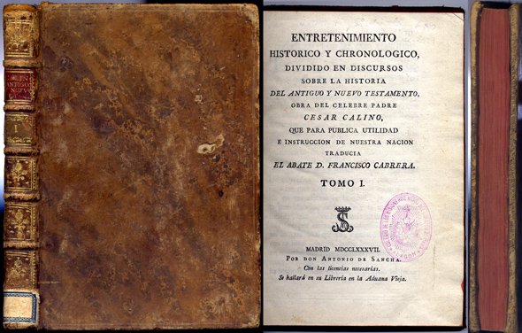 Entretenimiento histórico y chronológico, dividido en discursos sobre la historia del Antiguo y Nuevo Testamento. Traducía el Abate Don Francisco Cabrera. Tomo I (de diez): Desde la Creación del mundo a la llegada de los israelitas a la Tierra Prometida. | Livres anciens et modernes | Calino, Cesare.