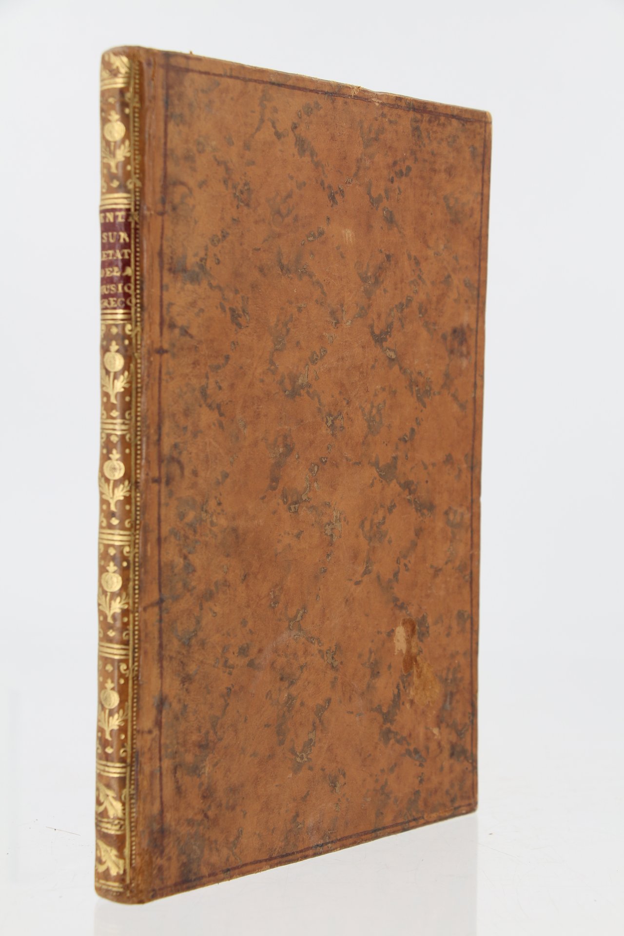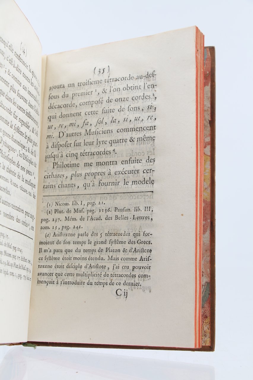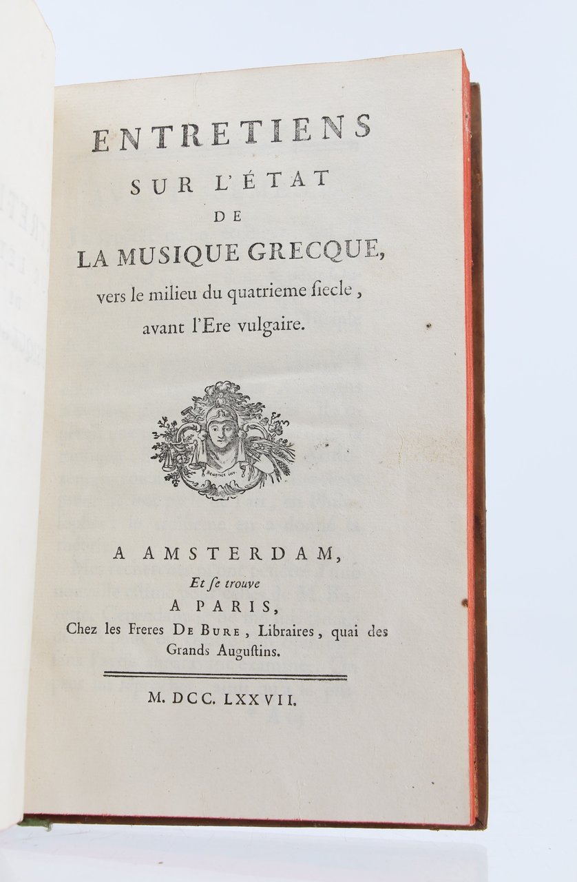 Chez les frères de Bure | à Amsterdam • & Paris 1777 | 13 x 20 cm | relié | [ENGLISH DESCRIPTION ON DEMAND] | Edition originale. Reliure en plein veau marbré d'époque.Dos lisse orné de fleurons dans des caissons. Pièce de titre en maroquin rouge. Bon exemplaire. Jean Jacques Barthélémy (1716-1795) fut d'abord un ecclésiastique avant d'être un archéologue, un littérateur et un numismate. Avant de publier le célèbre voyage d'Anacharsis, il se fit connaître par de nombreuses recherches érudites qu'il s'est employé à rendre accessible à un public plus large, non seulement dans Anacharsis, mais également dans cet opuscule sur la musique grecque, dans lequel on trouve un athénien dialoguant avec un disciple de Platon. Barthélémy s'attarde en outre sur la signification de la musique pour les athéniens, s'inspirant directement des écrits de Platon.