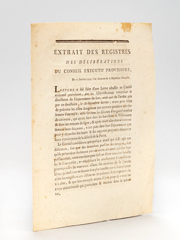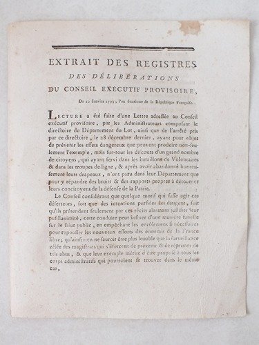 Extrait des Registres des Délibérations du Conseil Exécutif Provisoire du 10 Janvier 1793 [ Départements du Lot et de l'Ariège ] "Lecture a été faite d'une Lettre. ainsi que de l'arrêté. ayant pour objet de prévenir les effets dangereux que peuvent produire non seulement l'exemple, mais sur-tout les discours d'un grand nombre de citoyens, qui atant servi dans les bataillons de Volontaires & dans les troupes de ligne, & après avoir abandonné honteusement leurs drapeaux, n'ont paru dans leur Département que pour y répandre des bruits & des rapports propres à détourner leurs concitoyens de la défense de la Patrie" . "Le Conseil exécutif, en applaudissant au zèle qui a dicté la mesure énergique prise par le Département du Lot, estime toutefois