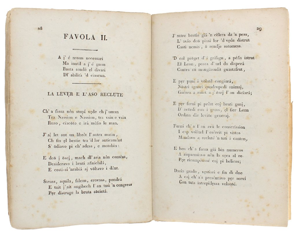 FAVOLE PIEMONTEISE POETICHE, CRITICHE, LETERARIE E MORAJ. Volume I delle "Opere Piemontèise". | Livres anciens et modernes | Peyron Amedeo (1785-1870)