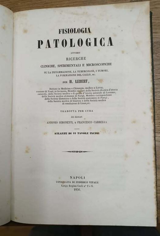 Fisiologia patologica ovvero Ricerche cliniche, sperimentali e microscopiche su la infiammazione, la tubercolosi, i tumori, la formazione del callo ... Atlante di 22 tavole incise | Livres anciens et modernes | Lebert, Hermann, ,Lebert, Hermann
