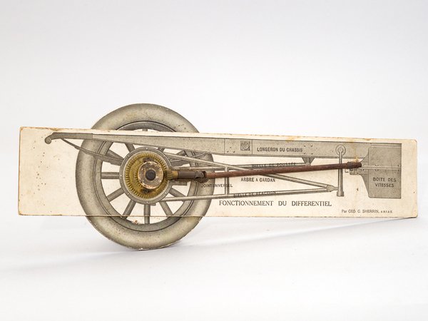 1 modèle mobile avec pièces en métal sur carton format 37,5 x 7 cm. et roue mobile de diamètre 12 cm., par Geo C. Sherrin, A.M.I.A.E. [construit par The Car Illustrated, Ltd, London, agence pour la France : OMNIA, Paris], s.d. [ circa 1910-1925 ] Etat très satisfaisant (carton frotté, toujours en état de fonctionnement). Rare exemplaire de la version française du "Working Model of Differential Gear"