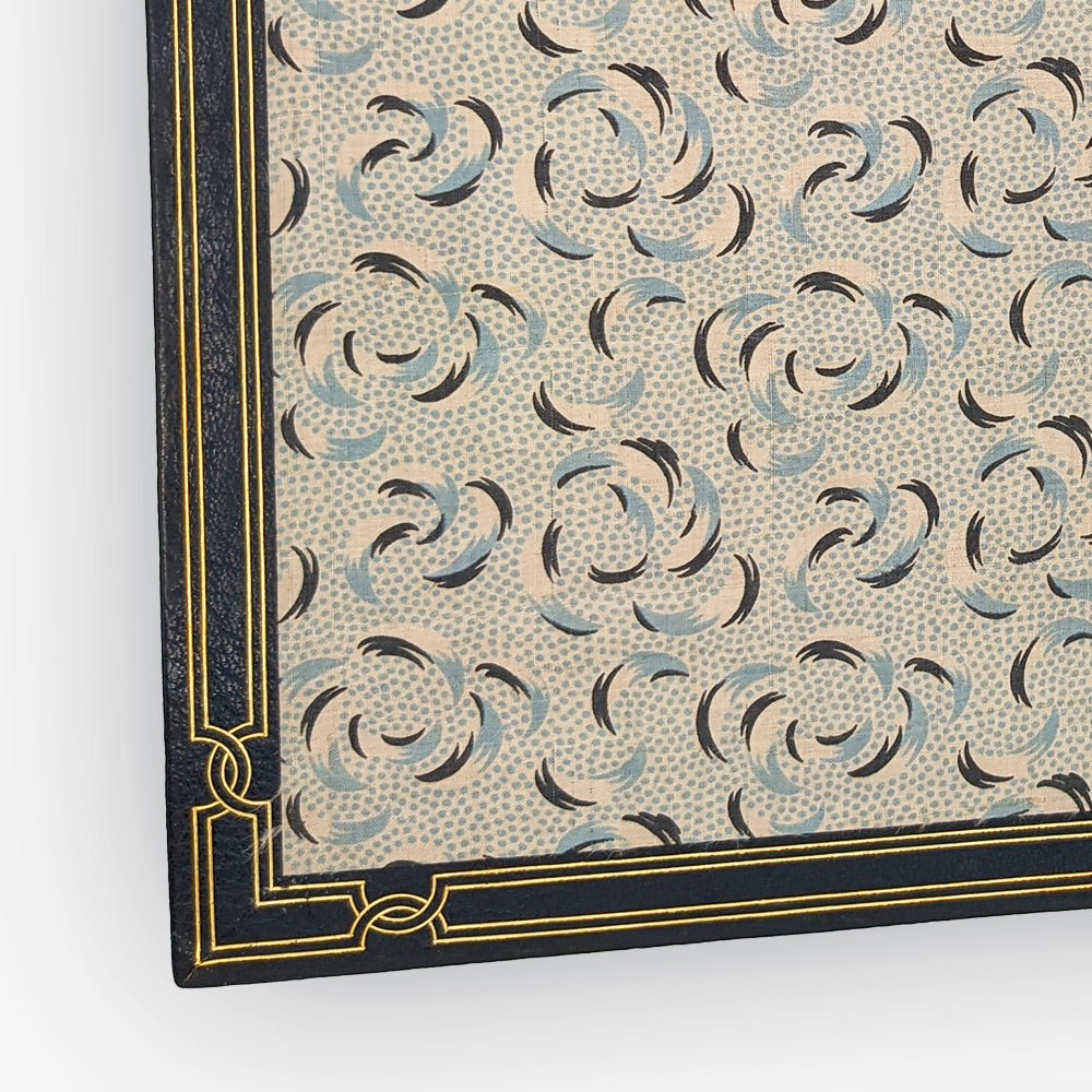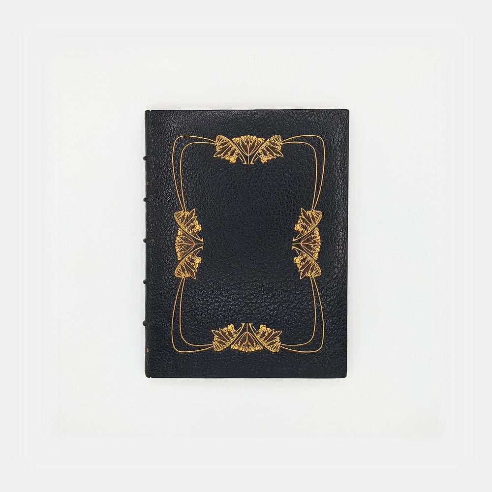 Full black Moroccan, spine with 5 ribs with gilded title piece. Floral composition in gilded iron in the art nouveau style identical on both covers. Inside covers and endpapers covered with a canvas printed with abstract shapes in shades of blue. The Moroccan extends onto the edges of the inside covers and forms a frame in which we find gilded vilets. 2nd and 3rd endpapers in marbled paper. Upper edge gilded. Illustrated cover preserved with condition in black. Slipcase.