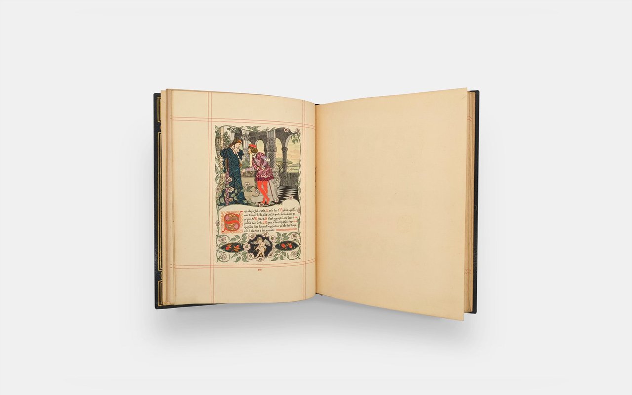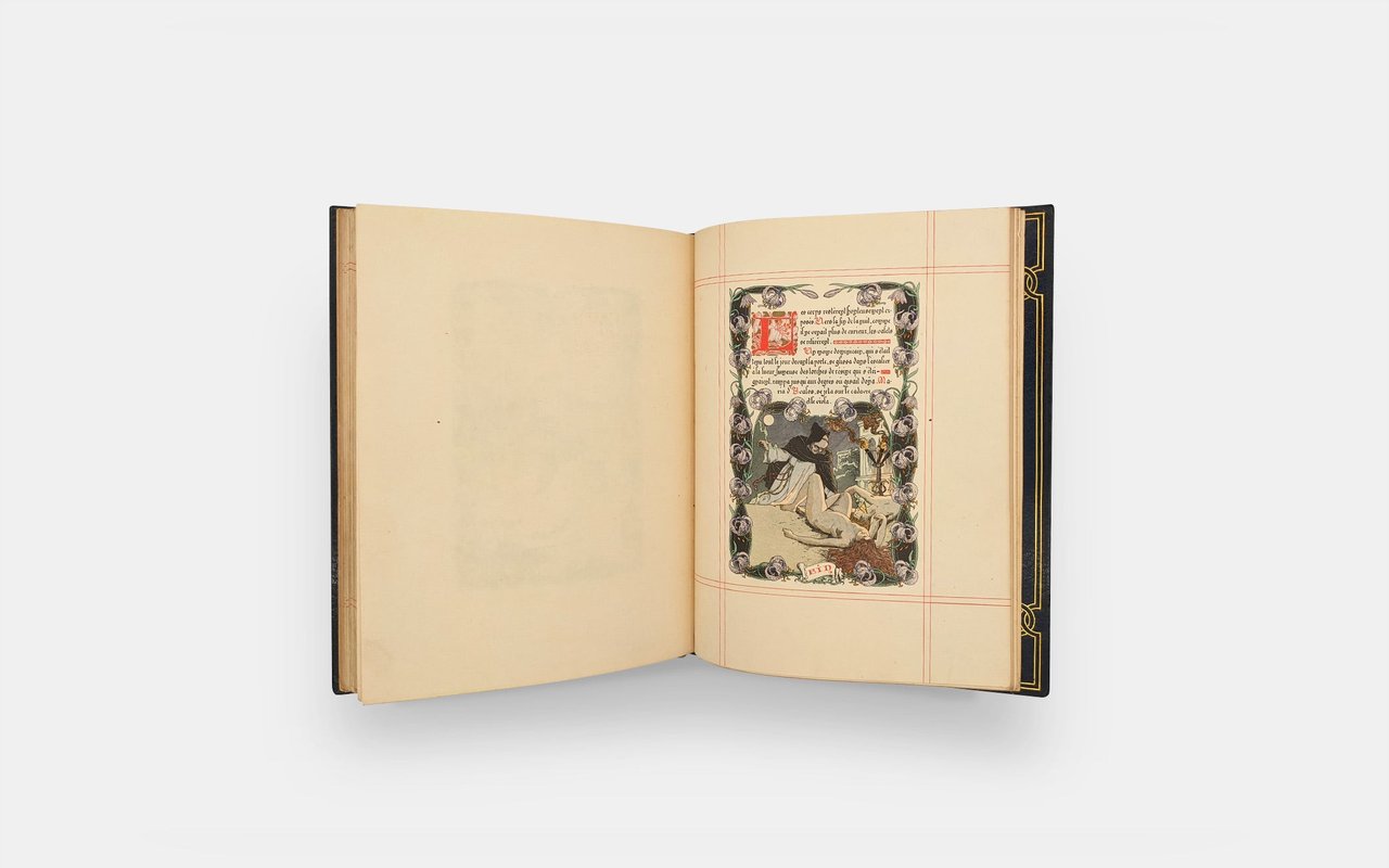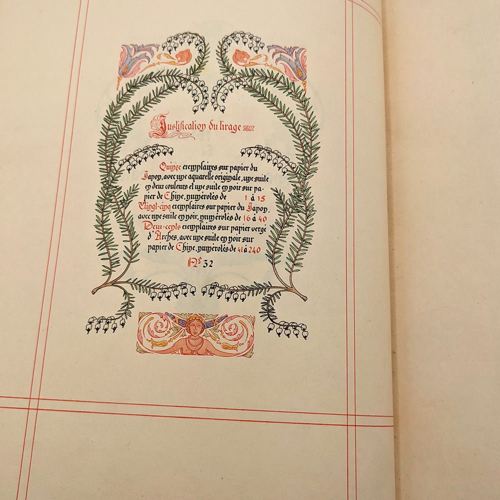 38 color compositions by Léon Lebègue with cover, half-title, justification, vignettes and text frame. The book takes up the style of illuminated manuscripts with ruled frames, Gothic-style typography and illustrations framing the text. The text is also hand-calligraphed by the artist.